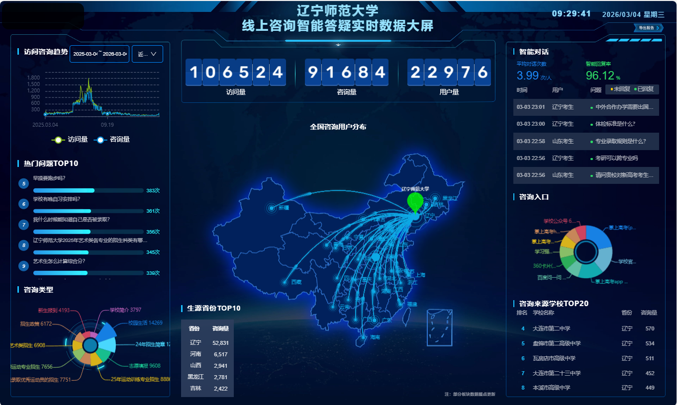 下一步,本科招生与就业处将总结寒假招生服务工作经验,整合各渠道反馈信息,依托智能咨询系统的数据优势,进一步完善智能问答库,深化AI赋能招生工作提质增效,以更优质的招生服务、更开放的办学姿态吸引优秀学子,为建设特色鲜明的高水平师范大学汇聚青春力量。